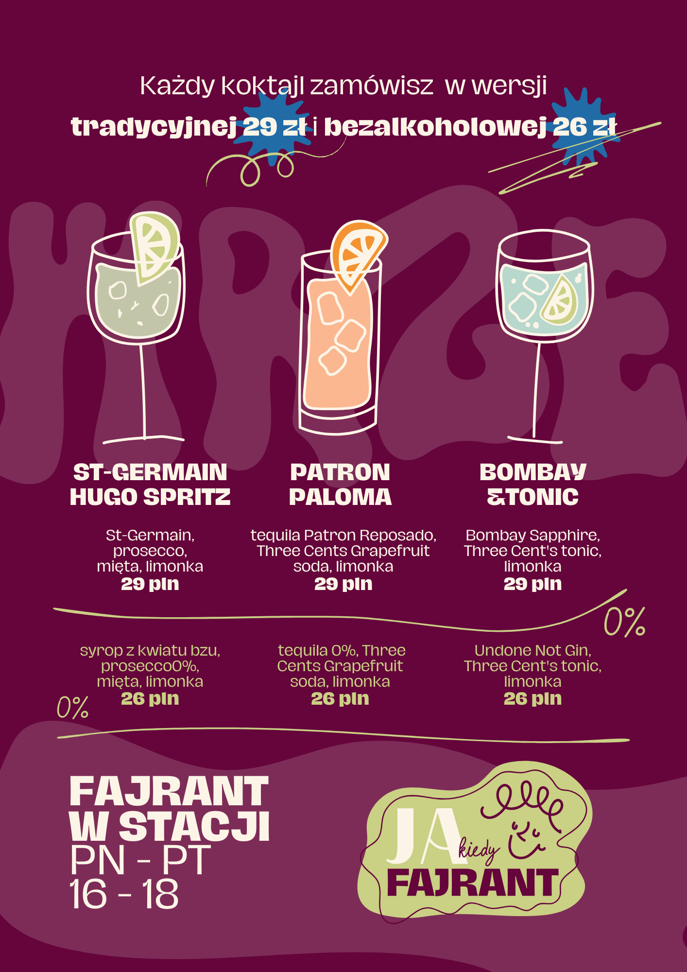 Wychodzimy naprzeciw wszystkim! W ramach „Fajrant w Stacji” każdy wybrany koktajl zamówisz w dwóch wariantach: tradycyjnym za 29 zł oraz bezalkoholowym 0% za jedyne 26 zł. Idealne dla kierowców, dbających o formę i tych, którzy po prostu mają ochotę na pyszny, orzeźwiający smak.