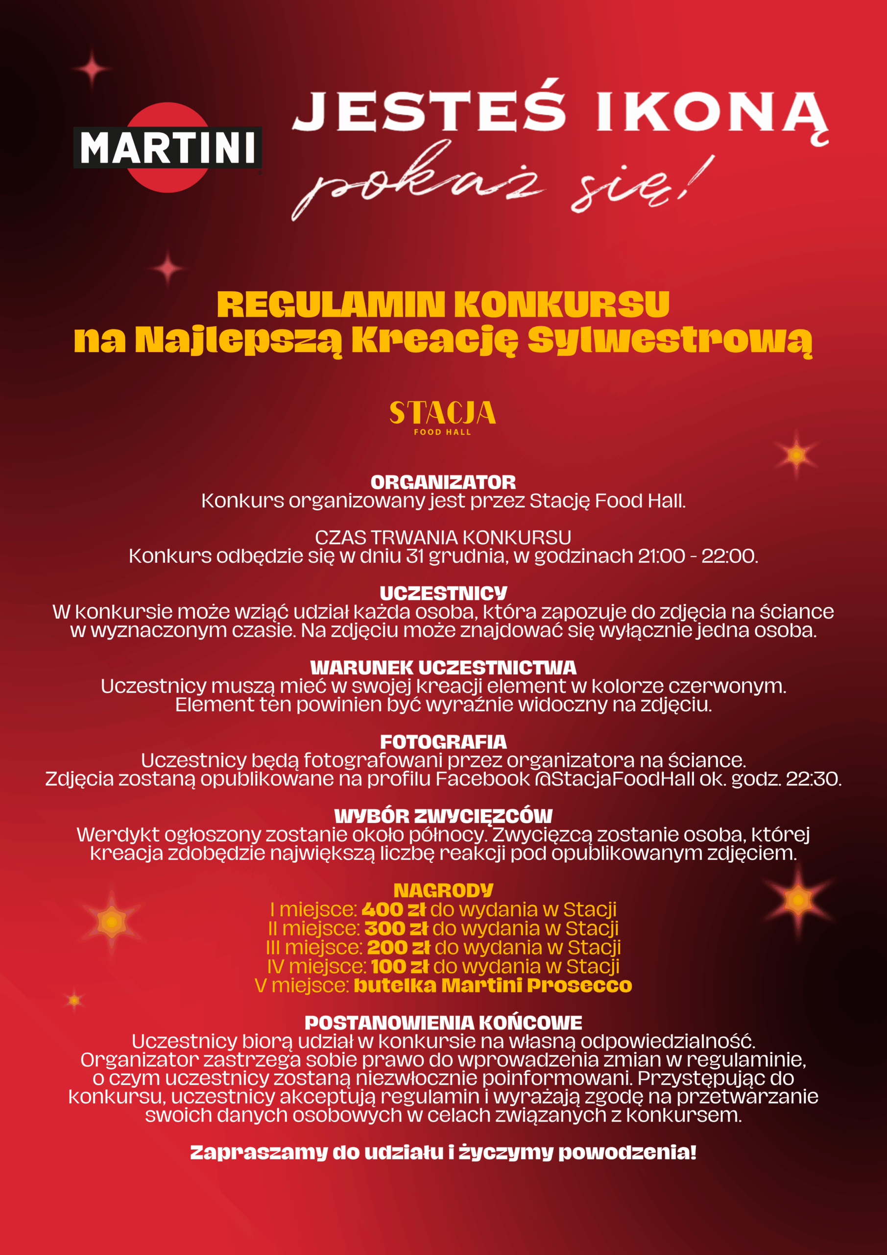 Zapraszany Was także do udziału w KONKURSIE na Najlepszą Kreację Sylwestrową! W tym roku stawiamy na CZERWIEŃ – kolor pasji, radości i szaleństwa! Przygotujcie swoje najpiękniejsze, czerwone kreacje lub wyraźne czerwone elementy i pozujcie do zdjęć na ściance Martini!
