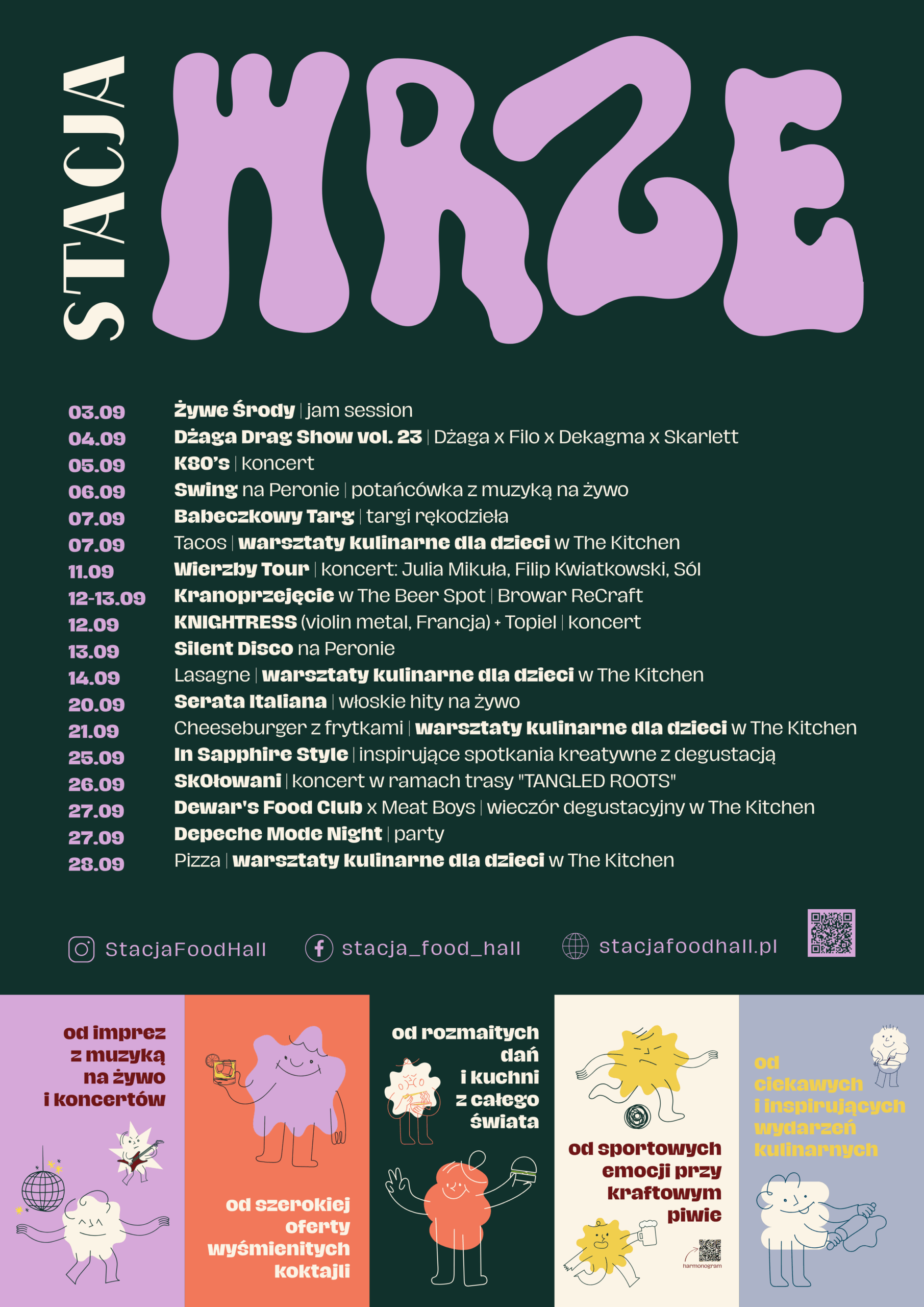 Przygotuj się na dawkę smaków, muzyki i emocji w samym sercu Wrzeszcza! We wrześniu Stacja Food Hall przekształca się w tętniące życiem centrum, oferując program, który zadowoli każdego – od poszukiwaczy kulinarnych wrażeń, przez miłośników dobrej muzyki, aż po zagorzałych kibiców. To idealne miejsce na spędzenie czasu, niezależnie od tego, czy szukasz relaksu przy jam session, kulinarnych warsztatów dla całej rodziny, czy sportowych emocji w gronie przyjaciół. Nasze przestrzenie – Peron 5, The Kitchen i The Beer Spot – są gotowe, by dostarczyć Ci niezapomnianych wrażeń.