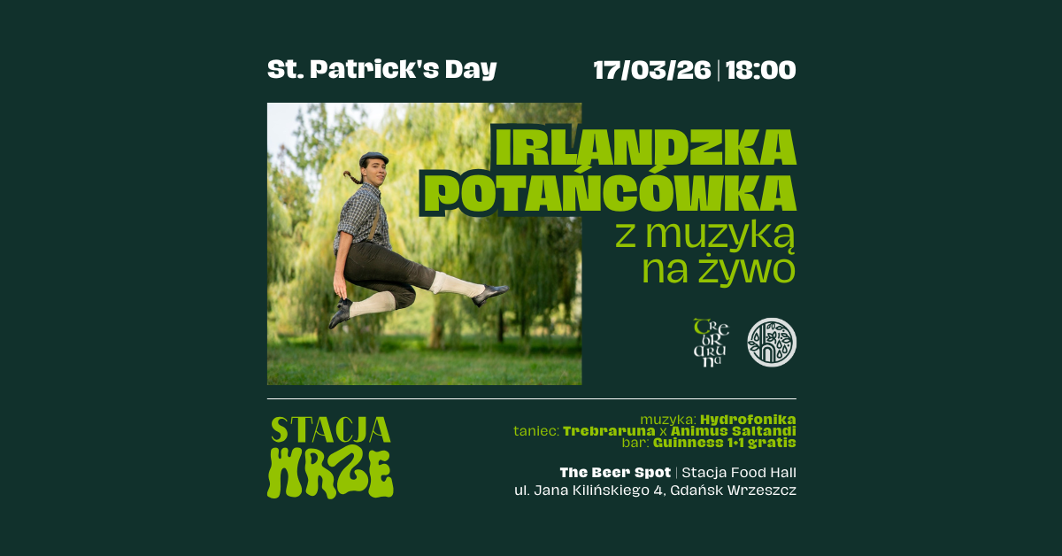 17.03 | Irlandzka Potańcówka z muzyką na żywo | St. Patrick’s Day: Na sam początek, ustalmy to – zapomnijcie, że to wtorek! Z okazji Dnia Świętego Patryka zamieniamy Stację Food Hall w tętniący życiem celtycki pub. Wyciągnijcie z szafy zielone ubrania, załóżcie wygodne buty i przygotujcie się na muzyczno – taneczny wieczór z Guinnessem w ręku, a nawet z dwoma Guinnessami. W programie: Céili [czyt. keili]: To tradycyjna potańcówka dla każdego! Prowadzący na bieżąco pokaże kroki i figury. Nie musisz mieć doświadczenia ani partnera – wystarczy, że odróżniasz prawą stronę od lewej i potrafisz liczyć do czterech | Muzyka na żywo: Zespół Hydrofonika zadba o autentyczne, akustyczne brzmienia prosto z Zielonej Wyspy. Skrzypce, flety i bouzuki porwą Was do tańca! | Pokazy taneczne: Profesjonalne skoki i niesamowitą energię zaprezentują weterani sceny – zespoły Trebraruna oraz Animus Saltandi. | Specjalna oferta w The Beer Spot: Dzień św. Patryka bez czarnego złota? Wykluczone! Mamy dla Was promocję na Guinnessa 1+1 – kupujesz jedno piwo, drugie dostajesz w prezencie!